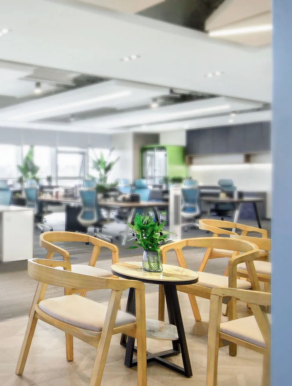茶水區域天花整體以洽談休閑為主要功能,天花用三角形對拼而成,感覺(jué)更富有層次,地面用魚(yú)骨紋地板對拼,上下呼應,更富有活力。
