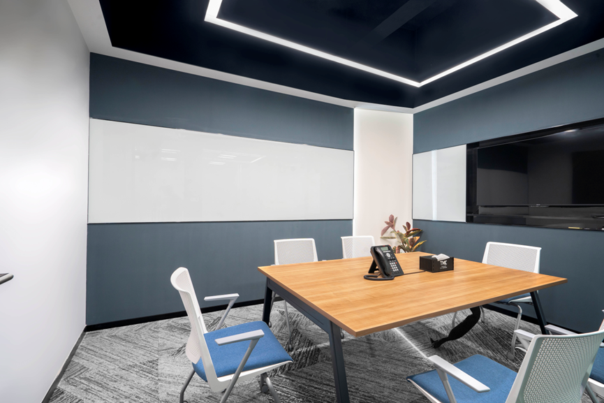 總經(jīng)理辦公室整體設計以木色和白色相結合,展現出高效和清新的氛圍。白色燈膜把墻面四周打亮,給辦公室增添了許多氛圍,并且更顯寬敞。藍色沙發(fā)的點(diǎn)綴為辦公室注入了生機和活力,與整體簡(jiǎn)約風(fēng)格形成和諧的對比。